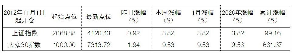 本報綜合消息 2026年首周,大盤呈現(xiàn)震蕩盤升的走勢。上證綜指上漲3.82%,深證成指上漲4.40%,創(chuàng)業(yè)板指上漲3.89%,大眾30指數(shù)上漲9.53%。