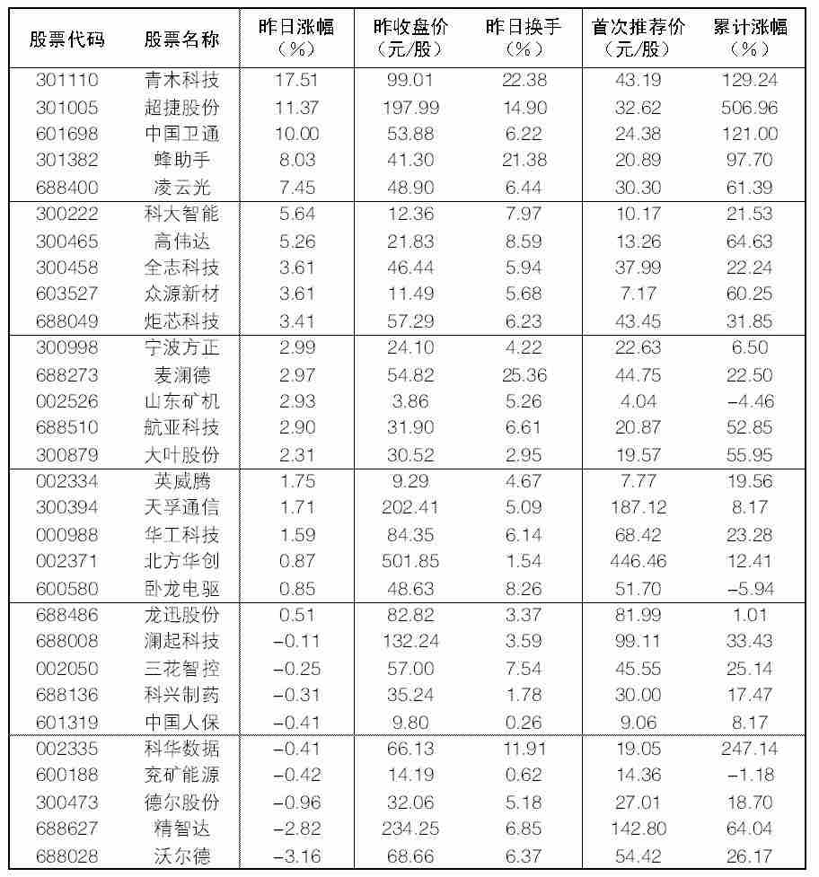 大眾30指數成份股中,12日漲幅前五位的分別是青木科技、超捷股份、中國衛通、蜂助手、凌云光,漲幅分別為17.51%、11.37%、10.00%、8.03%和7.45%;跌幅榜上,沃爾德、精智達、德爾股份、兗礦能源等跌幅居前。