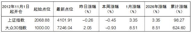 本報綜合消息 本周,受部分題材股大幅調整拖累,大盤沖高回落。上證綜指下跌0.45%,深證成指上漲1.14%,創業板指上漲1.00%,大眾30指數下跌0.93%。