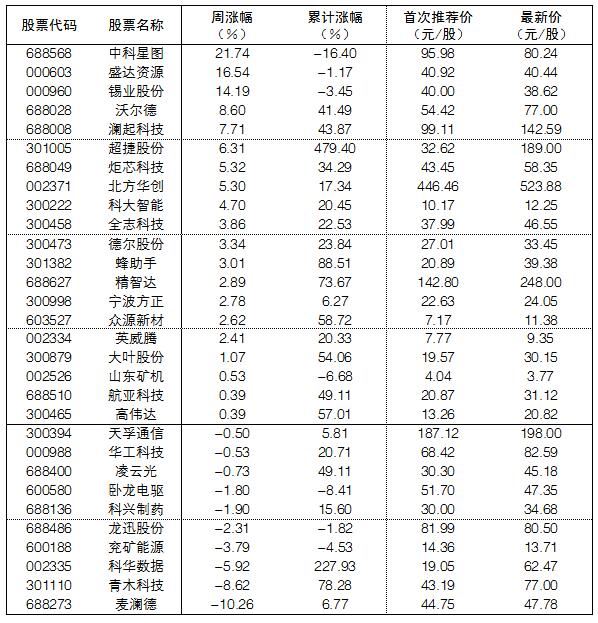 大眾30指數成份股中,本周漲幅前五位的分別是中科星圖、盛達資源、錫業股份、沃爾德、瀾起科技,漲幅分別為21.74%、16.54%、14.19%、8.60%和7.71%;跌幅榜上,麥瀾德、青木科技、科華數據、兗礦能源等跌幅居前。