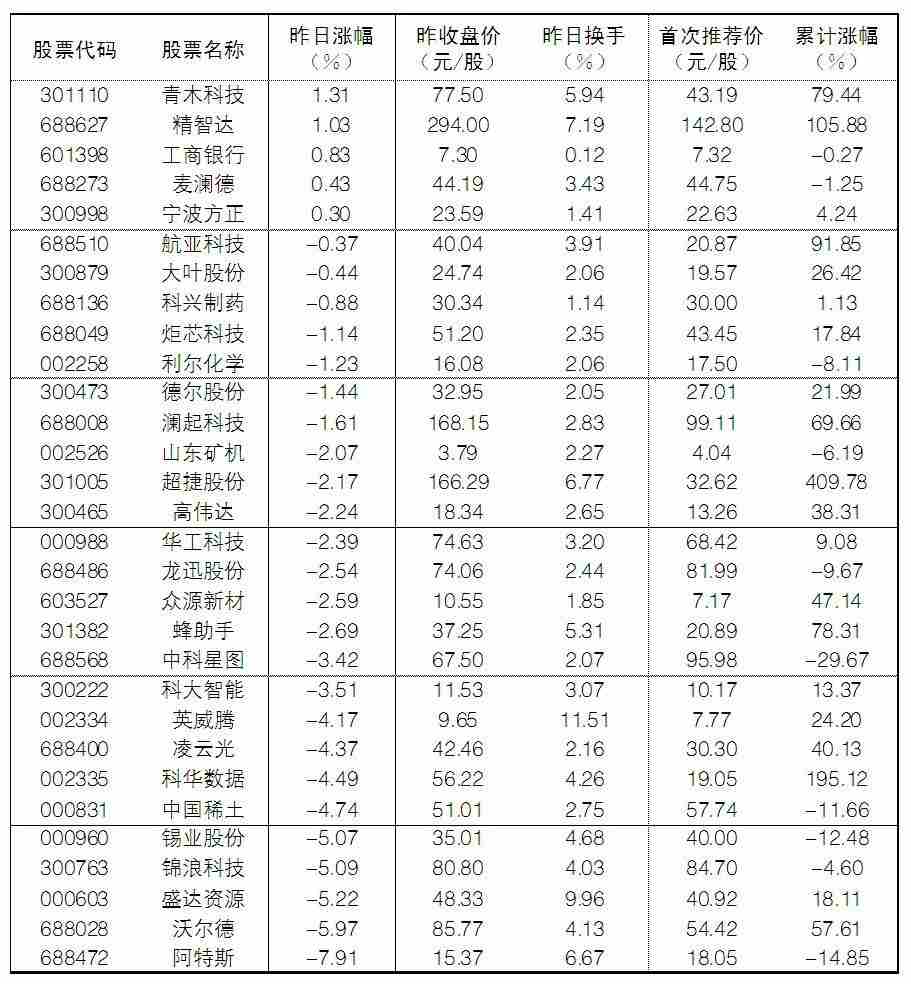 大眾30指數成份股中,5日漲幅前五位的分別是青木科技、精智達、工商銀行、麥瀾德、寧波方正,漲幅分別為1.31%、1.03%、0.83%、0.43%和0.30%;跌幅榜上,阿特斯、沃爾德、盛達資源、錦浪科技等跌幅居前。