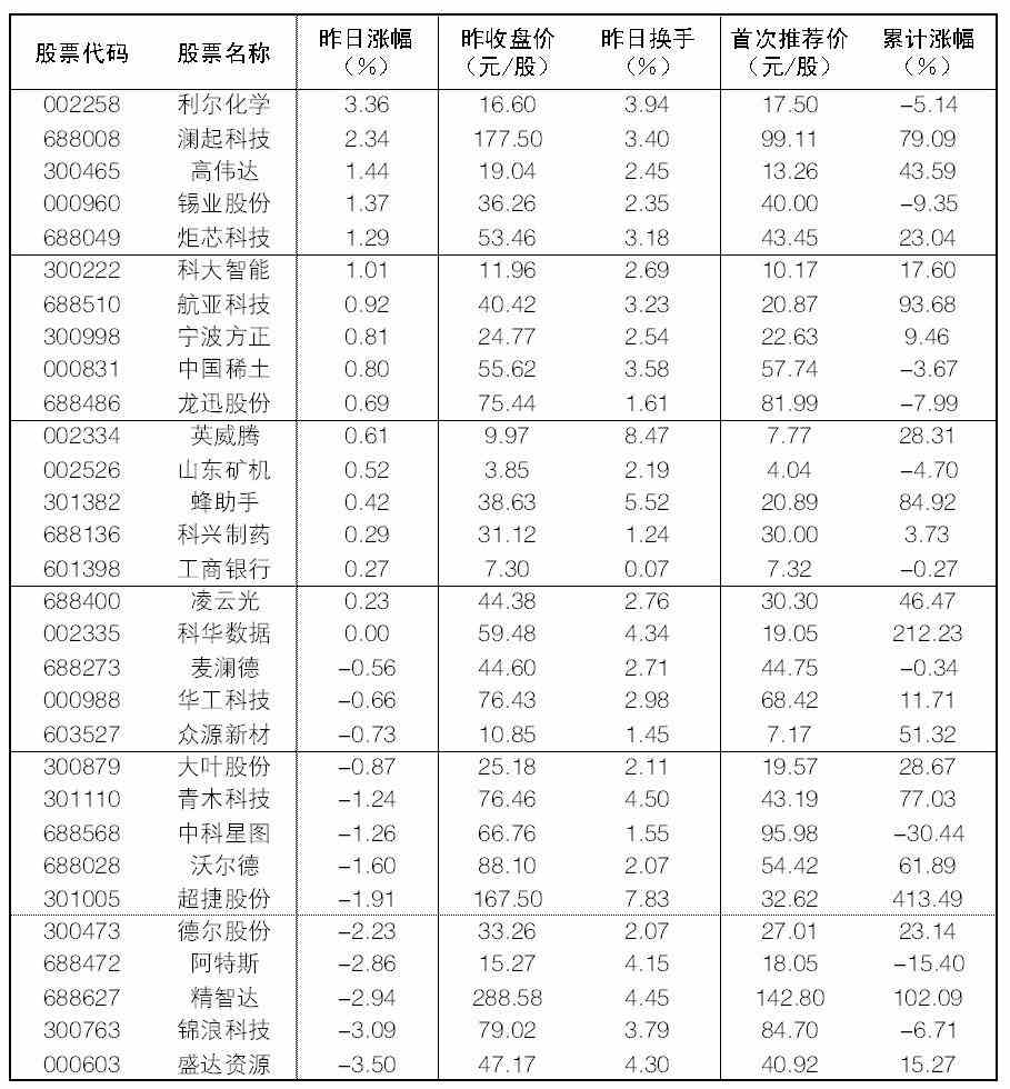 大眾30指數成份股中,10日漲幅前五位的分別是利爾化學、瀾起科技、高偉達、錫業股份、炬芯科技,漲幅分別為3.36%、2.34%、1.44%、1.37%、1.29%;跌幅榜上,盛達資源、錦浪科技、精智達、阿特斯等跌幅居前。