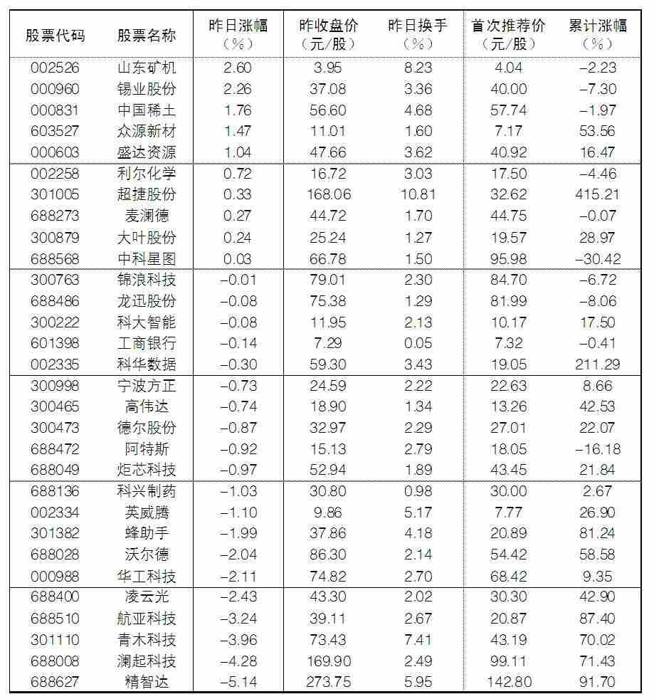 大眾30指數成份股中,11日漲幅前五位的分別是山東礦機、錫業股份、中國稀土、眾源新材、盛達資源,漲幅分別為2.60%、2.26%、1.76%、1.47%和1.04%;跌幅榜上,精智達、瀾起科技、青木科技、航亞科技等跌幅居前。
