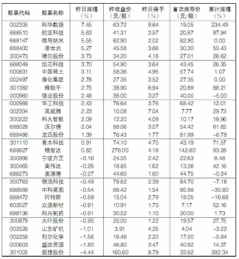 大眾30指數成份股中,12日漲幅前五位的分別是科華數據、航亞科技、凌云光、德爾股份、炬芯科技,漲幅分別為7.45%、5.63%、5.27%、3.73%、3.70%;跌幅榜上,超捷股份、盛達資源、利爾化學等跌幅居前。