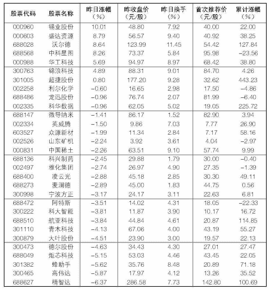 大眾30指數(shù)成份股中,2日漲幅前五位的分別是錫業(yè)股份、盛達資源、沃爾德、中科星圖、華工科技,漲幅分別為10.01%、8.79%、8.64%、8.26%和5.69%;跌幅榜上,精智達、高偉達、蜂助手、炬芯科技等跌幅居前。