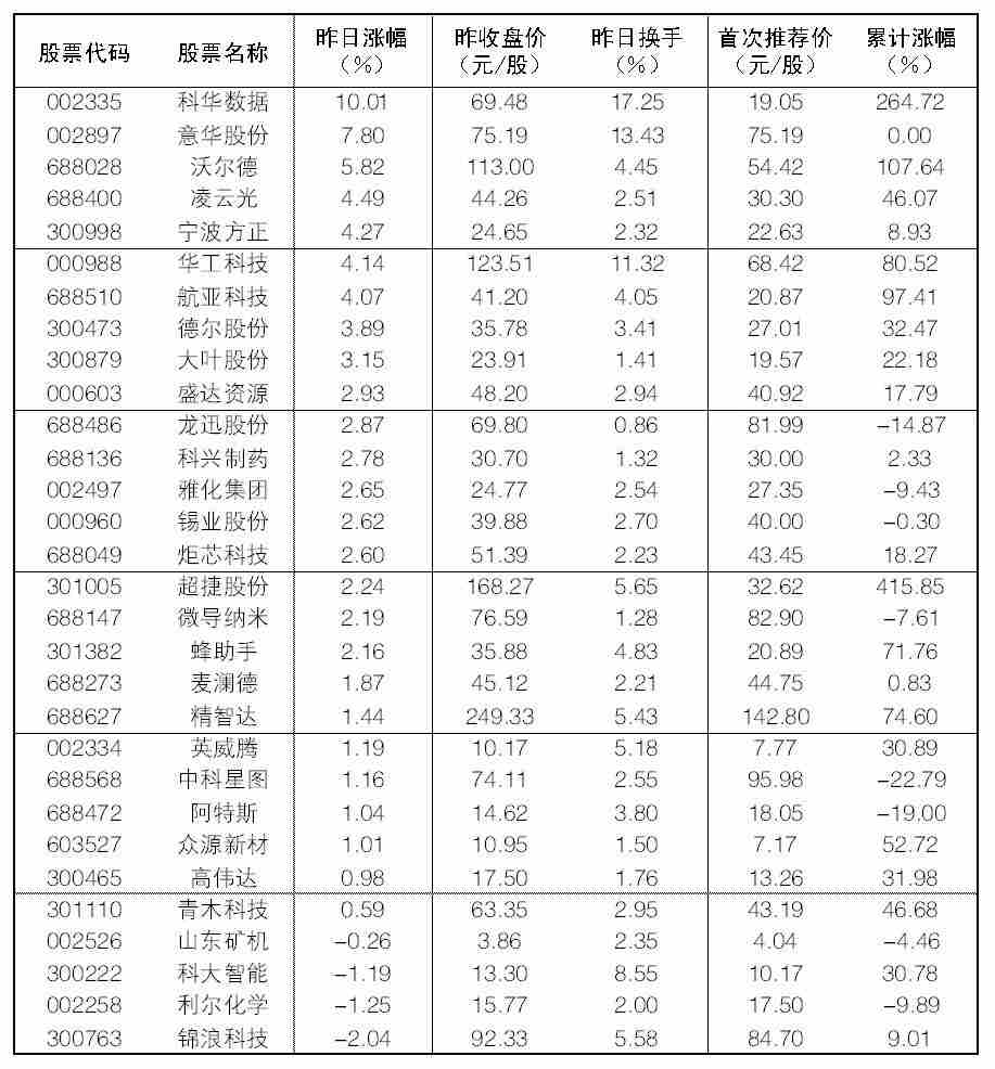 大眾30指數(shù)成份股中,10日漲幅前五位的分別是科華數(shù)據(jù)、沃爾德、凌云光、寧波方正、華工科技,漲幅分別為10.01%、5.82%、4.49%、4.27%、4.14%;跌幅榜上,錦浪科技、利爾化學(xué)、農(nóng)業(yè)銀行、科大智能等跌幅居前。