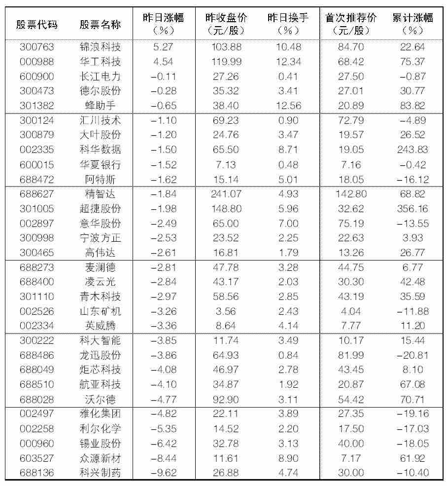 大眾30指數成份股中,19日逆市上漲的分別是錦浪科技、華工科技,漲幅分別為5.27%、4.54%;跌幅榜上科興制藥、眾源新材、錫業股份、利爾化學、雅化集團等跌幅居前。