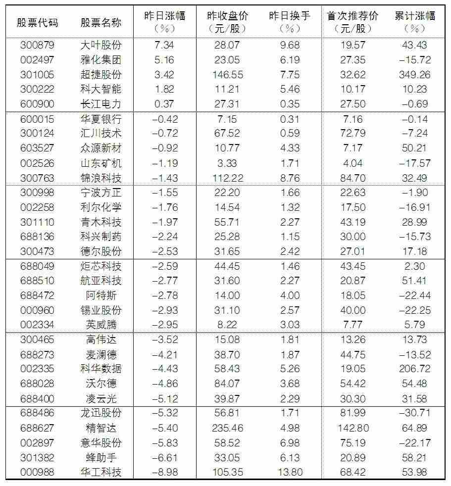 大眾30指數成份股中,26漲幅前五位的分別是大葉股份、雅化集團、超捷股份、科大智能、長江電力,漲幅分別為7.34%、5.16%、3.42%、1.82%和0.37%;跌幅榜上,華工科技、蜂助手、意華股份、精智達等跌幅居前。