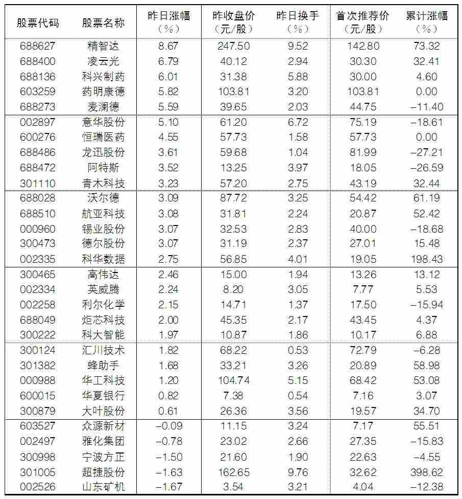 大眾30指數成份股中,1日漲幅前五位的分別是精智達、凌云光、科興制藥、麥瀾德、意華股份,漲幅分別為8.67%、6.79%、6.01%、5.59%和5.10%;跌幅榜上,錦浪科技、山東礦機、超捷股份等跌幅居前。值得一提的是,精智達股價1日上漲超過8%。精智達主營業務是新型顯示器件檢測設備的研發、生產和銷售,主要產品包括光學檢測及校正修復系統、老化系統、觸控檢測系統、信號發生器、檢測系統配件、半導體存儲器件測試等。近日,精智達公告稱,公司擬定增近30億元,投向半導體存儲測試設備研發及產業化智造等項目。