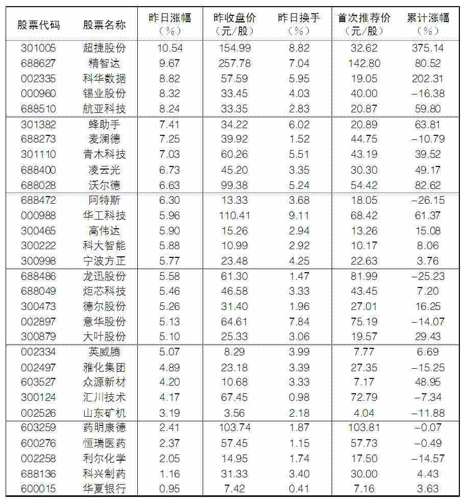 大眾30指數成份股中,8日漲幅前五位的分別是超捷股份、精智達、科華數據、錫業股份、航亞科技,漲幅分別為10.54%、9.67%、8.82%、8.32%和8.24%;漲幅相對較小的有華夏銀行、科興制藥、利爾化學、恒瑞醫藥。