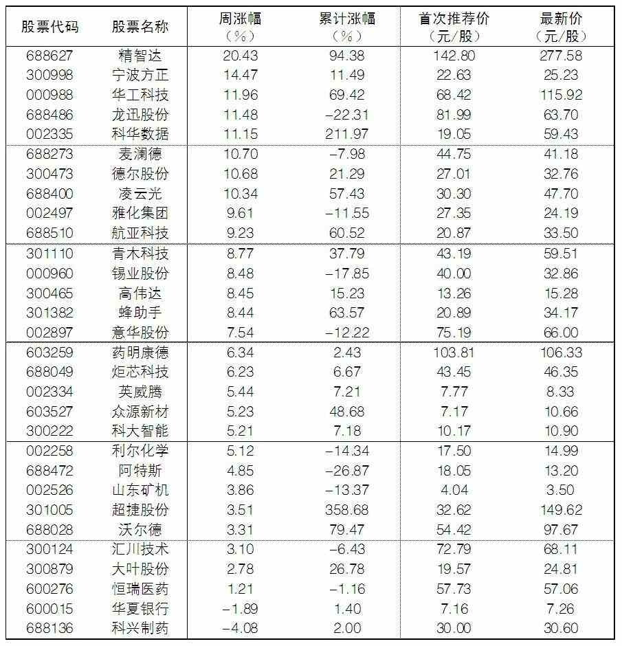 大眾30指數(shù)成份股中,本周漲幅前五位的分別是精智達(dá)、寧波方正、華工科技、龍迅股份、科華數(shù)據(jù),漲幅分別為20.43%、14.47%、11.96%、11.48%和11.15%;跌幅榜上,科興制藥、華夏銀行等跌幅居前。