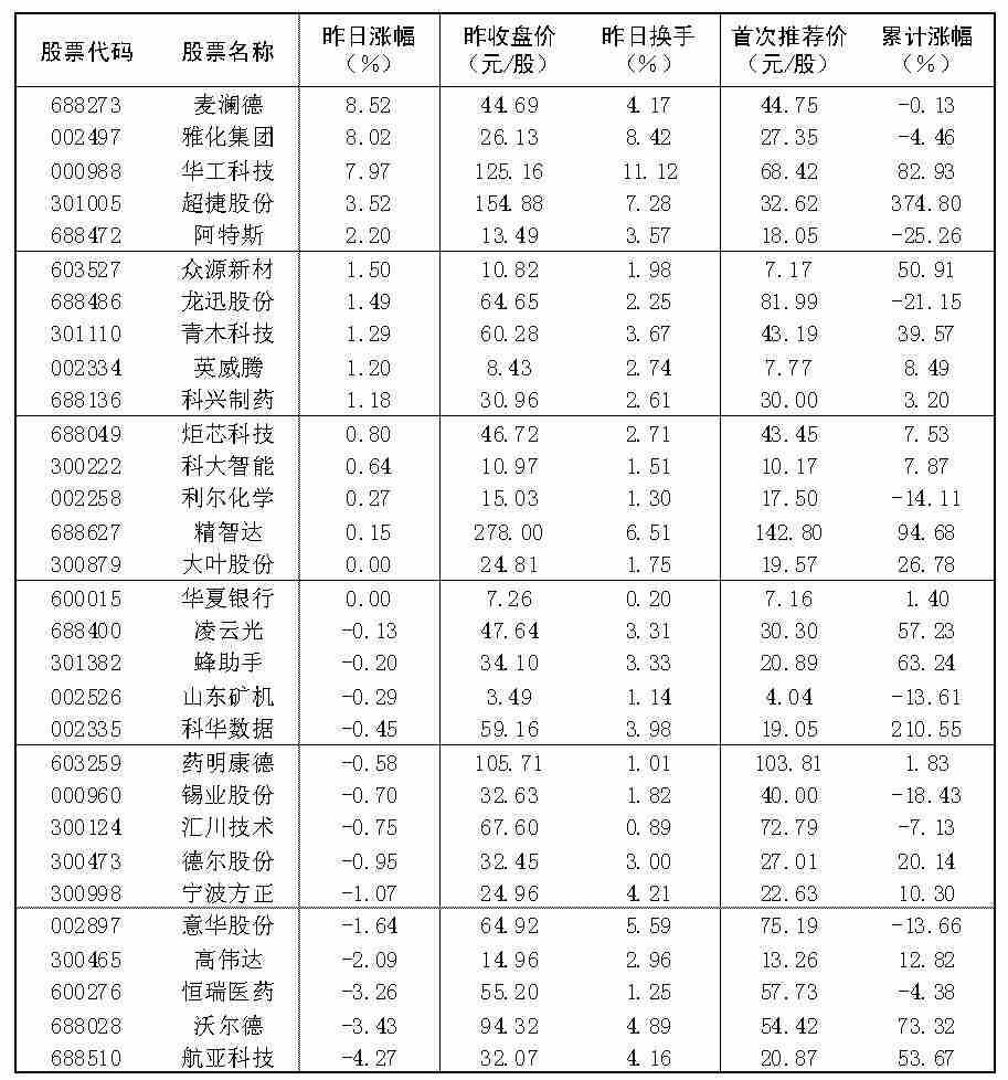 大眾30指數成份股中,13日漲幅前五位的分別是麥瀾德、雅化集團、華工科技、超捷股份、阿特斯,漲幅分別為8.52%、8.02%、7.97%、3.52%和2.20%;跌幅榜上,航亞科技、沃爾德、恒瑞醫藥、高偉達等跌幅居前。