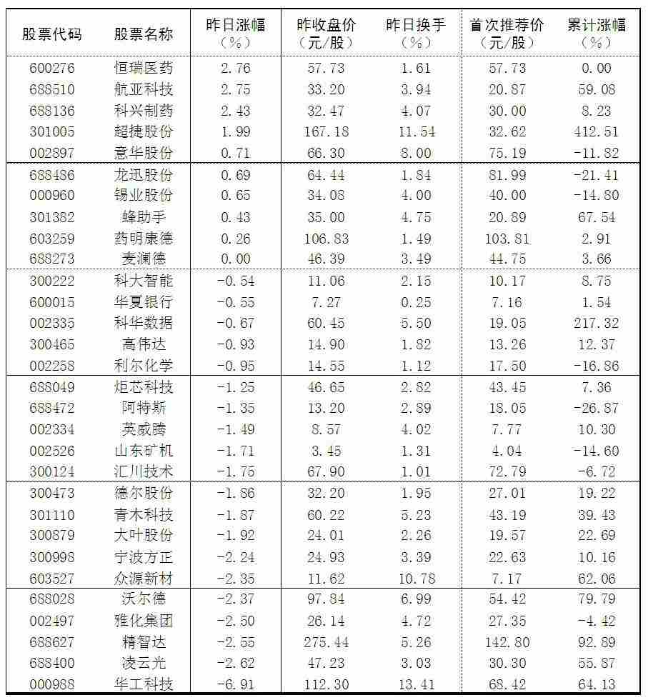 大眾30指數成份股中,15日漲幅前五位的是恒瑞醫藥、航亞科技、科興制藥、超捷股份、意華股份,漲幅分別為2.76%、2.75%、2.43%、1.99%和0.71%;跌幅榜上,華工科技、凌云光、精智達、雅化集團等跌幅居前。