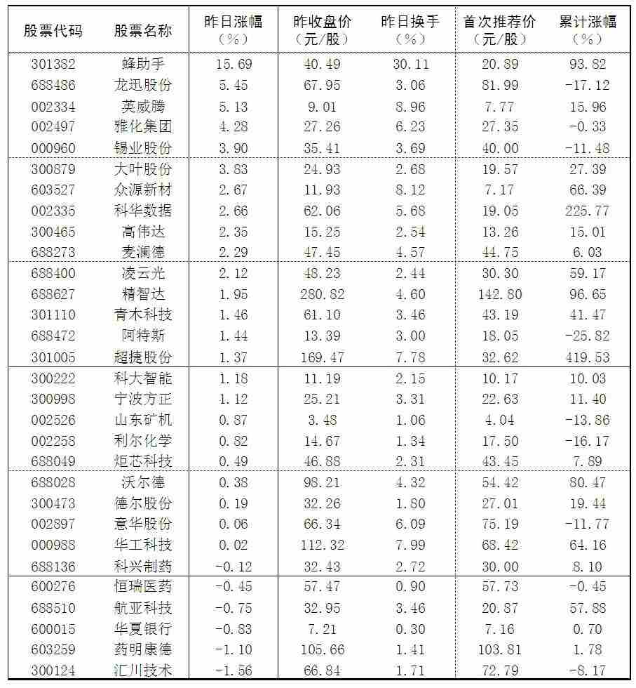 大眾30指數(shù)成份股中,16日漲幅前五位的分別是蜂助手、龍迅股份、英威騰、雅化集團(tuán)、錫業(yè)股份,漲幅分別為15.69%、5.45%、5.13%、4.28%、3.90%;跌幅榜上,匯川技術(shù)、藥明康德、華夏銀行、航亞科技等跌幅居前。